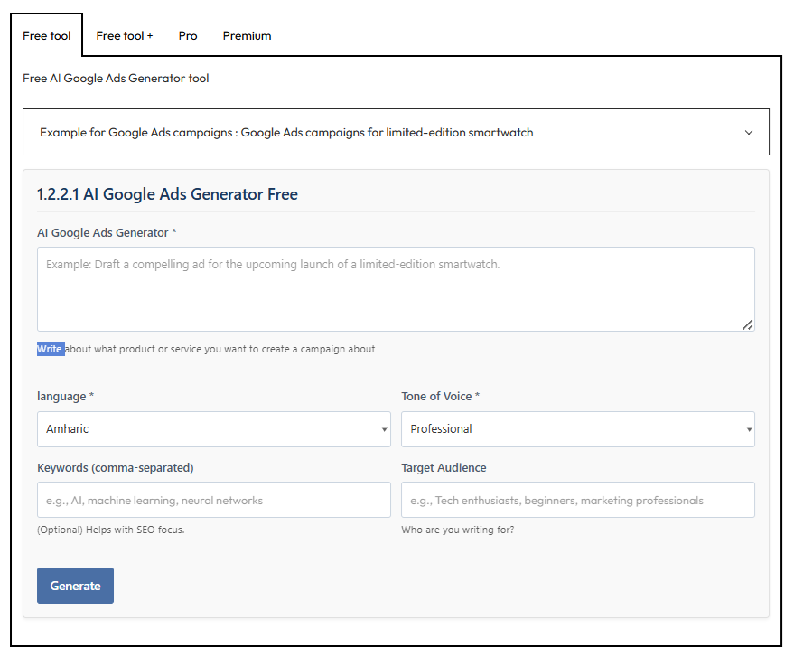 - Free AI-powered Google Ads Generator tool